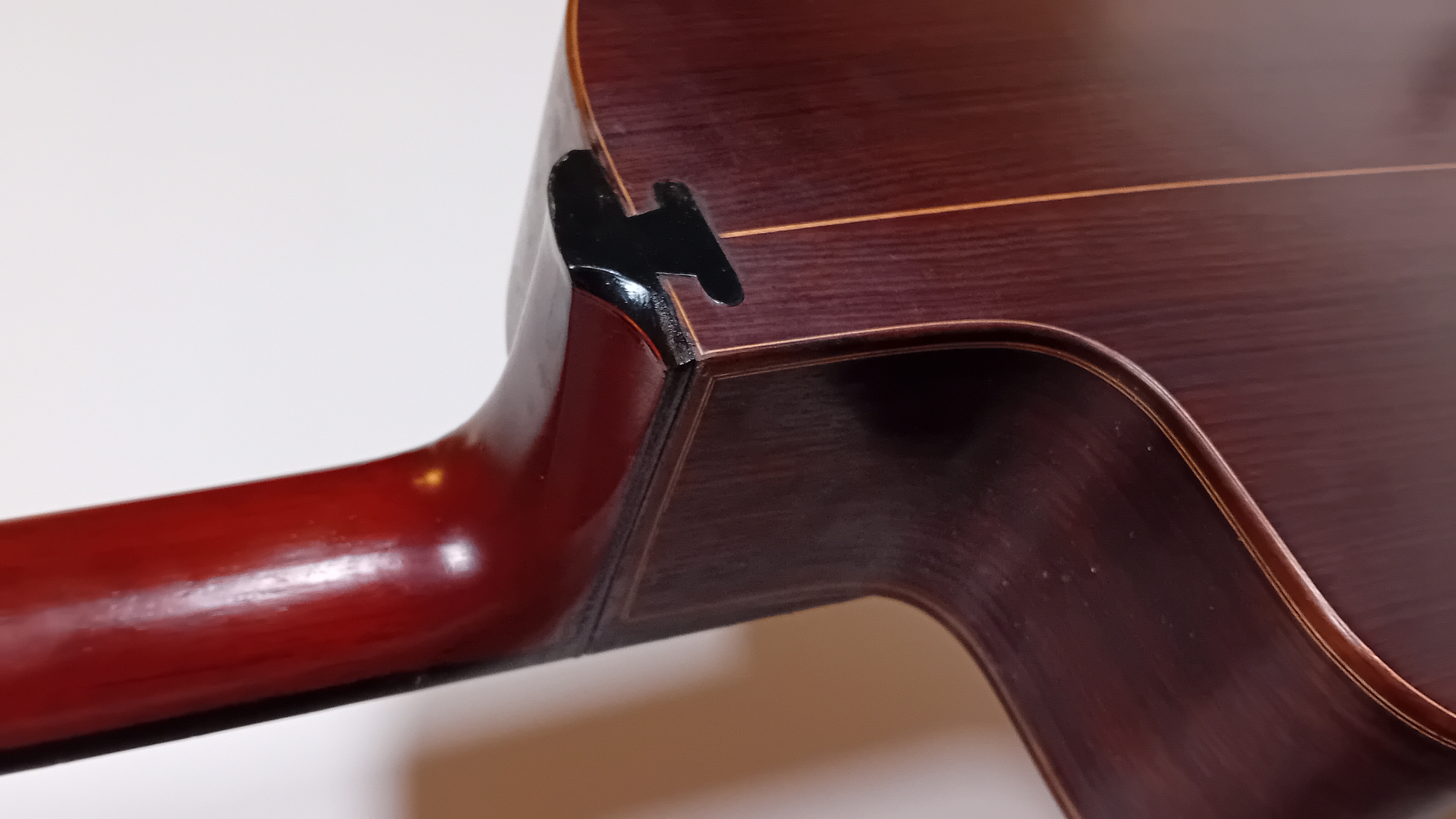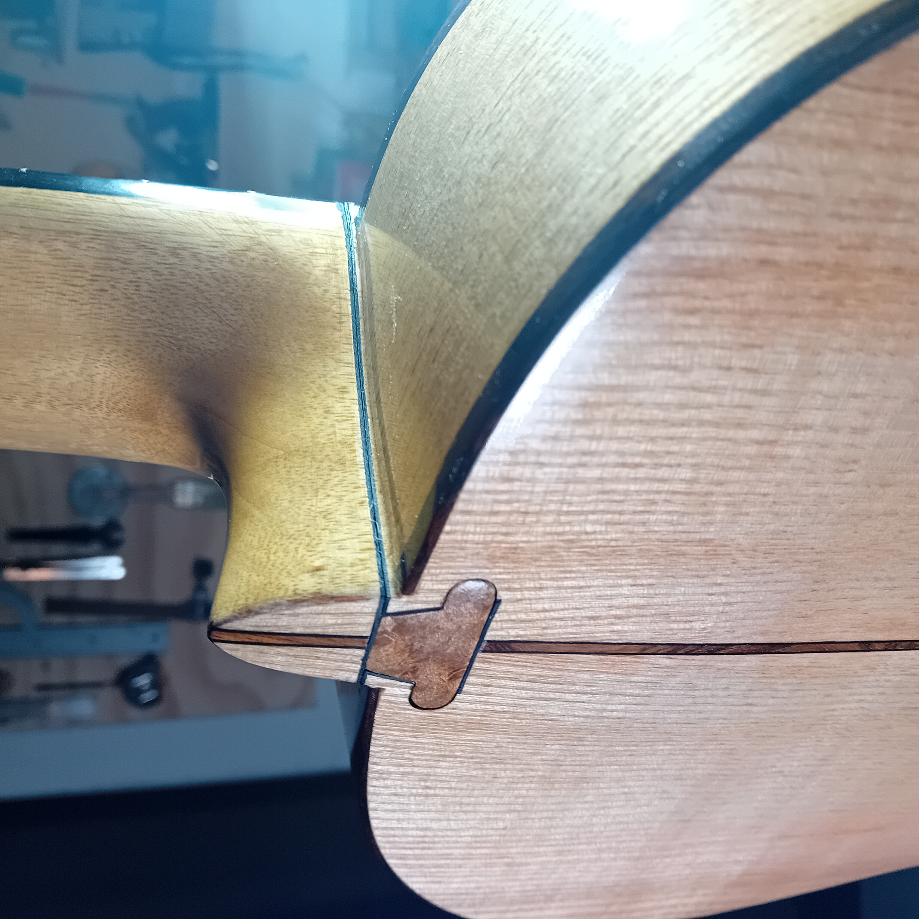 La unión es 100% en madera, técnica de cola de milano. Sin tornillos, sin adhesivos, sin ningún elemento metálico que pueda afectar la resonancia.