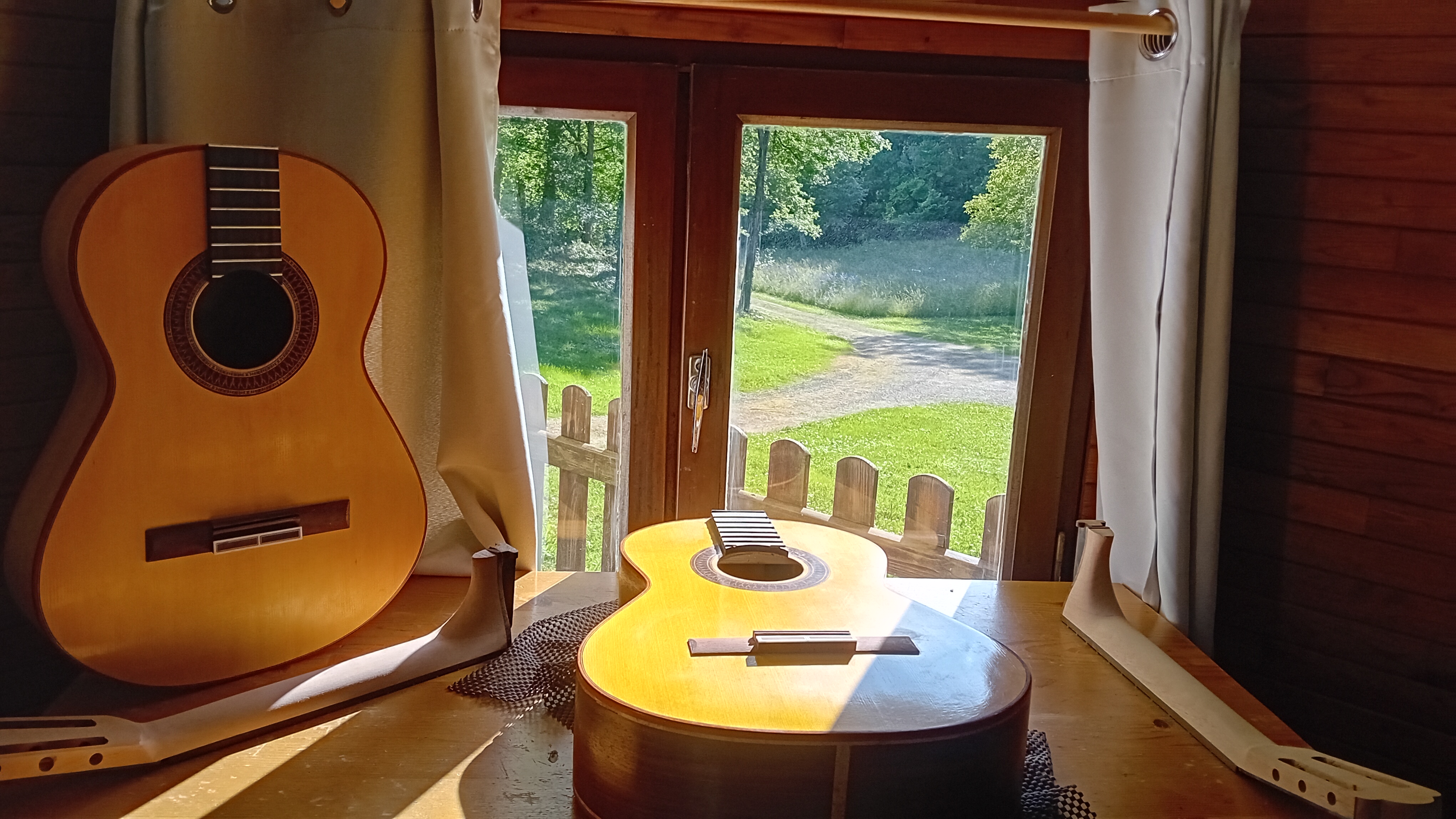 Consultar transformación¿Ya tienes una guitarra que te encanta? Te la transformo. Me envías tu instrumento en una caja especial que yo mismo te mando primero. En el taller le instalo el sistema Pullaway y te la devuelvo en una caja de 55 × 40 × 20 cm — perfecta para equipaje de mano.